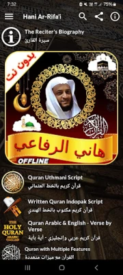 Al Quran Offline Hani ar Rifai app ne na Alkur'ani mai girma ga wayoyin Android. Yana dauke da cikakken karatun Hani ar Rifai a tsarin MP3. Wannan app yana aiki ba tare da intanet ba kuma yana samar da cikakkiyar gogewa ga mai amfani.