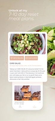 Cikin mahimman fasalulluka na **RESET** akwai: bidiyoyi na musamman da kuma girke-girke daga Caroline Deisler da kanta, waɗanda ba za ka samu a wani wuri ba. Haka kuma, akwai tsarukan yau da kullun waɗanda za su ba ka jagoranci a tafiyarka ta neman lafiya. Kowane girke-girke yana zuwa da umarni masu sauƙin bi, don haka ko da ba ka da gwaninta a dafa abinci, za ka iya shirya shi cikin sauƙi. Akwai kuma ma'ajiyar abubuwan ciki mai bincike, don tsarawa abincinka gwargwadon bukatunka da zaɓinka.